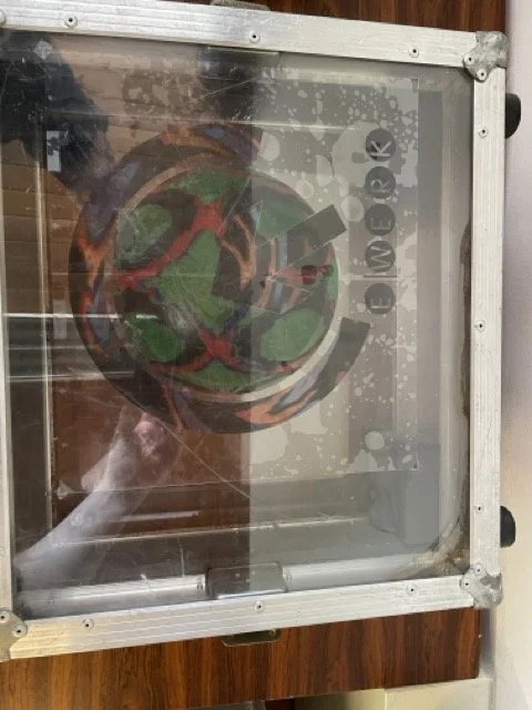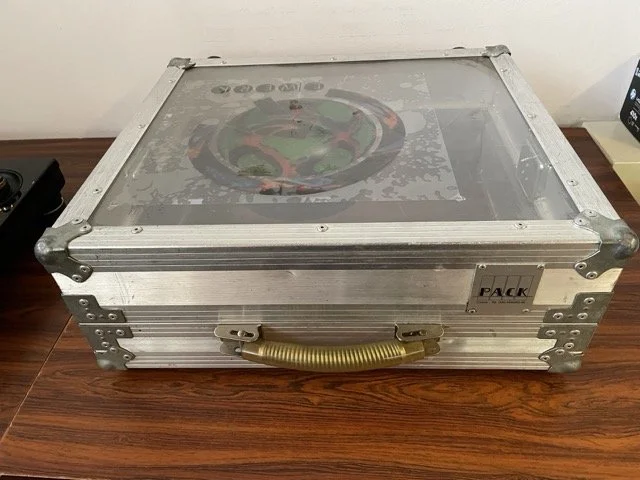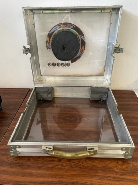 Da das E-Werk umtriebig war und gerne mal in anderen Hallen zum Tanz aufspielte, wurden zum Schutz der kostbaren Player, speziell konfektionierte, professionelle Flight Cases gebaut. Ganz im Rock’n’Roll Design, allerdings in klarem Plexiglas und mit eigens produzierten E-Werk (Twirl)-Aufklebern. Glamour für die Glamour Crew!